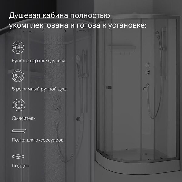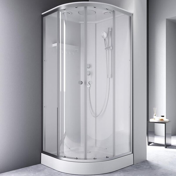 Душевая кабина Am.Pm X-Joy, W94C-401-090MT, 90 х 90 см, с крышей, стекло прозрачное, профиль хром матовыйДушевая кабина X-Joy - это ультрасовременное решение для вашей ванной комнаты. Она сочетает в себе функциональность, стильный дизайн и надежные материалы. Алюминиевый профиль устойчив к коррозии. Одинарные ролики обеспечивают легкое и бесшумное открывание. Кабина оснащена 5-режимным ручным душем, стильным смесителем и компактной полкой, на которой разместится все необходимое. Герметичная конструкция защищает помещение от брызг воды. Кабина X-Joy обеспечит вам незабываемые ощущения и станет настоящим украшением вашей ванной комнаты.Высота 210 смШирина 89.5 смШирина входа: 49 смОриентация: универсальнаяФорма четверть кругаНаличие сифона: естьТропический душ: даДиаметр сифона: 52 ммАнтискользящее покрытиеКонструкция дверей раздвижныеКоличество секций двери: 2Материал профиля алюминийМатериал поддона: ABS-пластикЦвет профиля: хром матовыйПолки: даЭкран не съемныйВид поддона низкийВысота поддона, мм: 140Глубина поддона, мм: 45Материал изделия: стекло; ABS-пластик; алюминийТолщина двери 4 ммМатериал задних стенок: стеклоЦвет задней стенки: белыйЦвет стекол и цвет полотна двери: прозрачныйКрыша естьМонтаж: пристенный в уголГарантия производителя: 3 годаСтрана: ГерманияКомплектация: поддон, профили, передние стекла, набор креплений, задние стенки, верхний душ, ручной душ, купол с верхним душем, инструкция